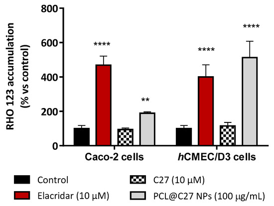 As observed in Figure 9, no significant difference in RHO123 intracellular fluorescence was verified when C27 was tested, when compared to control cells. On the contrary, elacridar (10 µM) acted as a P-gp inhibitor, avoiding the RHO 123 efflux from both cellular models, which resulted in a 5-fold increase in RHO123 intracellular fluorescence, when compared to control cells (p < 0.0001). The same behavior was obtained with PCL@C27 NPs. In this case, an increase of 1.9- and 5-fold of RHO 123 intracellular levels was found for the Caco-2 and hCMEC/D3 cells, respectively. This data is in accordance with other works, which showed that NPs coated with Tween 80 have a good capacity to inhibit P-gp [76,77].
