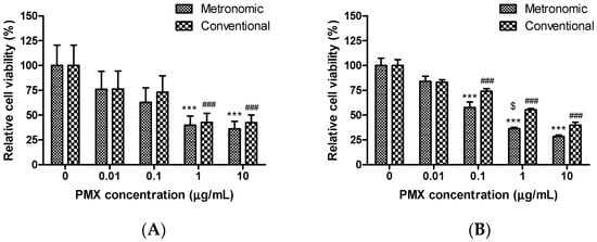 The effects of conventional and metronomic administration of PMX were assessed by cell cytotoxicity assays. Adenocarcinomic human alveolar basal epithelial cells (A549 cells) were purchased from the American Type Culture Collection (ATCC, Manassas, VA, USA) and cultured in Dulbecco’s modification of Eagle medium (DMEM; Corning, Manassas, VA, USA) supplemented with 10% fetal bovine serum (FBS; Corning, Manassas, VA, USA) and 1% penicillin/streptomycin (Gibco, Thermo Fisher Scientific). Human umbilical vein endothelial cells (HUVECs) were purchased from PromoCell (Heidelberg, Germany) and were cultured in Endothelial Cell Growth Medium MV2 (ECGM, PromoCell, Heidelberg, Germany) supplemented with 10% FBS and 1% penicillin/streptomycin. A549 cells and HUVECs were seeded at the concentration of 5 × 103 cells per well on 96-well culture plates and allowed to grow for 24 h. The cells were then treated with PMX at different concentrations of 0, 0.01, 0.1, 1, and 10 µg/mL and incubated for 72 h in 5% CO2 at 37 °C. Metronomic dosing was simulated by aspirating and replacing the media with freshly prepared media containing PMX every 24 h [12,30]. Then, a cytotoxicity assay was performed using the Cell Counting Kit-8 (CCK-8; Dojindo Molecular Technologies, Rockville, MD, USA) according to the manufacturer’s instructions. Briefly, after the completion of treatment, 10 µL of 2-(2-methoxy-4-nitrophenyl)-3-(4-nitrophenyl)-5-(2,4-disulfophenyl)-2H-tetrazolium monosodium salt (WST-8) reagent was added to each well and incubated at 37 °C for 2 h. Absorbance was then measured in the microplate reader (Synergy HTX; Bio-Tek, Winooski, VT, USA) at 450 nm.