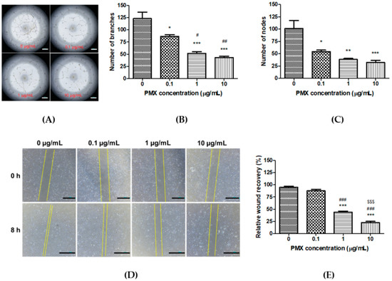 The in vitro endothelial tube formation assay was performed as described in our previous studies [31,32]. Briefly, 100 µL Matrigel were loaded into each well of a 96-well culture plate and incubated at 37 °C for 30 min, for polymerization. Then, 3 × 104 HUVECs in ECGM media with 10% FBS and PMX at different concentrations (0, 0.1, 1, and 10 µg/mL) were loaded over Matrigel into each well. After 24-h incubation at 37 °C, the number of branches and nodes were counted at 20× magnification using a microscope (Eclipse Ts2, Nikon Instruments Inc., Melville, NY, USA). The acquired images were analyzed with ImageJ for quantification.