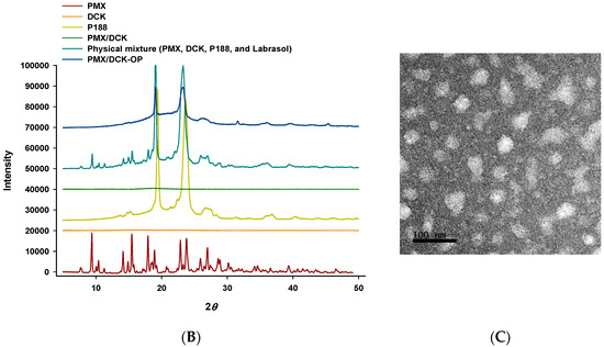 To confirm complexation between PMX and DCK and maintenance of such complexation in PMX/DCK-OP as well as the crystalline properties of PMX, DCK, P188, and PMX/DCK, a physical mixture of PMX, DCK, P188, and Labrasol, and separately PMX/DCK-OP were assessed via powder X-ray diffraction (PXRD). Powder samples were placed on an adhesive support (0.5 mm in thickness) and analyzed with the aid of a D8 Advance diffractometer (Bruker AXS GmbH, Karlsruhe, Germany) operating at 40 mA and 40 kV to deliver copper (Cu-Kα1) radiation (λ = 1.5418 Å) in the step-scan mode over a diffraction angle (2θ) of 5–50° at a scan rate of 0.02°/s. We also measured the particle size, the polydispersity index (PDI), and the zeta potential of PMX/DCK-OP in water, to confirm micelle formation in the solution state. PMX/DCK-OP was diluted with deionized water (1:20, w/v), followed by sonication for 1 min to minimize scattering. Next, particle size and surface charge were measured using a dynamic laser light scattering instrument (Malvern Zetasizer Nano ZS90; Malvern Instruments, Malvern, UK) operating at 25 °C. The particle size and morphology of PMX/DCK-OP were confirmed via transmission electron microscopy (TEM). PMX/DCK-OP dispersed in deionized water (1:100, w/v) was negatively stained with 2% (w/v) phosphotungstic acid, dropped onto a copper grid, and examined via high-resolution TEM (HR-TEM; JEM-200; JEOL, Tokyo, Japan).
