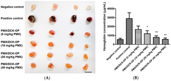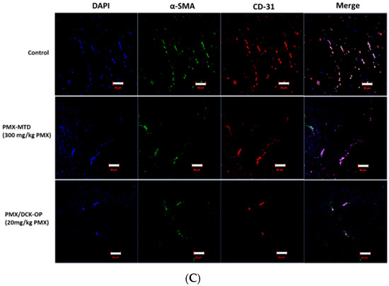 A Matrigel plug assay was used to evaluate the in vivo anti-angiogenic activities of PMX/DCK-OP, as previously described with some modifications [9,31]. A total of 500 µL of Matrigel (Corning, Manassas, VA, USA) supplemented with or without 500 ng/mL of VEGF165 and 500 ng/mL of bFGF was injected subcutaneously into the ventral side of each 6-week-old female C57BL/6 mouse. The mice inoculated with Matrigel only (without any supplement) were used as the negative control group, whereas those treated with both Matrigel and supplements were used as the positive control and treatment groups. The treatment groups were distributed into four groups as follows: PMX/DCK-OP (5 mg/kg PMX), PMX/DCK-OP (10 mg/kg PMX), PMX/DCK-OP (20 mg/kg PMX), and PMX/DCK-OP (40 mg/kg PMX), and received once-a-day oral PMX/DCK-OP equivalent to 5 mg/kg, 10 mg/kg, 20 mg/kg, and 40 mg/kg of PMX, respectively. No treatment was administered to the negative and positive control groups. Seven days after administration, all mice were sacrificed and the Matrigel plugs were extracted. Hemoglobin content was analyzed immediately by homogenizing each plug in 200 µL hypotonic lysis buffer (0.1% Brij-35 solution) and centrifuging for 20 min at 15,000 rpm. Twenty µL of the supernatant were incubated with 100 µL Drabkin’s reagent in a 96-well plate and incubated for 15 min at room temperature. Absorbance was measured at 540 nm using a microplate reader.