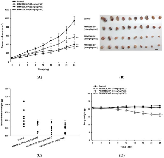 In vivo tumor growth inhibitory effects of PMX/DCK-OP in A549 xenografts. After tumor volume reached 50–70 mm3, the mice were randomized (n = 10 mice per group) into (1) Control group, receiving saline, (2) the PMX/DCK-OP (10 mg/kg PMX) group, receiving once daily administration of 10 mg/kg PMX/DCK-OP based on PMX, (3) the PMX/DCK-OP (20 mg/kg PMX) group, receiving once daily administration of 20 mg/kg PMX/DCK-OP based on PMX, and (4) the PMX/DCK-OP (40 mg/kg) group, receiving once daily administration of 40 mg/kg PMX/DCK-OP based on PMX. (A) Tumor volume of different groups. (B) Image of isolated tumors from each group on day 24. (C) Tumor weight of mice on day 24. (D) Body weight graph of different groups. Bar means 10 mm. Data are expressed as mean ± SEM. * p < 0.05, ** p < 0.01, *** p < 0.001 compared to the control group.