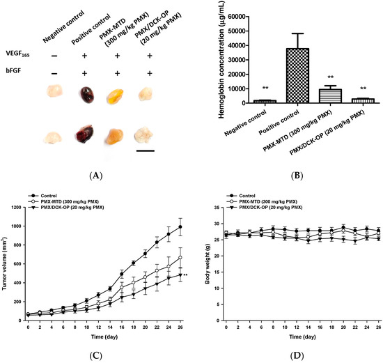 Anti-angiogenic and anti-cancer effect of MCT vs. MTD treatment of PMX. (A) Image of Matrigel plugs extracted from C57BL/6 mice inoculated with Matrigel with or without VEGF165 and bFGF and receiving saline in the negative and positive control groups, intraperitoneal injection of PMX 300 mg/kg/week as MTD, and oral administration of PMX/DCK-OP 20 mg/kg/day (based on PMX) as MCT. (B) Quantification of hemoglobin content from Matrigel (n = 5 per group). (C) Tumor growth profiles of A549 xenografted mice receiving saline as a control, intraperitoneal injection of PMX 300 mg/kg/week as PMX-MTD, and oral administration of PMX/DCK-OP 20 mg/kg/day (based on PMX) (n = 6 per group). (D) Body weight profiles. Bar means 10 mm. Data are expressed as mean ± SEM. ** p < 0.01 compared to the control group.