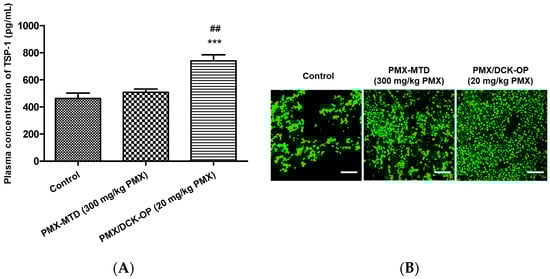 The TSP-1 level indicates the extent of anti-angiogenesis action during metronomic therapy. Several studies have shown that TSP-1 inhibits angiogenesis during metronomic treatment [11,35]. The effect of MCT on the levels of angiogenesis-related factors in the peripheral blood of lung cancer-bearing mice was assessed at the end of treatment. An ELISA revealed that the circulating TSP-1 level in the control group was 463 ± 40.0 pg/mL. The TSP-1 levels in the PMX-MTD (300 mg/kg PMX) and PMX/DCK-OP (20 mg/kg PMX) groups were 509 ± 24.2 and 740 ± 45.3 pg/mL (p < 0.001), respectively (Figure 8A). The TSP-1 level of PMX/DCK-OP (20 mg/kg PMX)-treated mice was 1.45-fold greater than that of the PMX-MTD (300 mg/kg PMX) group (p < 0.01). Thus, oral MCT of the PMX/DCK-OP (20 mg/kg PMX) group increased the peripheral TSP-1 level. However, conventional PMX-MTD (300 mg/kg PMX) chemotherapy did not increase the TSP-1 level compared to that of the control group, indicating that MTD did not reduce the mobilization or viability of the circulating endothelial precursor cells (CEPs) that contribute to tumor angiogenesis [9]. Tumor growth suppression by PMX-MTD (300 mg/kg PMX) may be attributable to the cytotoxic effect of an antifolate agent, thus not to an anti-angiogenic effect secondarily mediated by TSP-1. On the other hand, metronomic treatment effectively increased the circulating TSP-1 level compared to that of a control group [9]. We next assessed the effect of an endogenous inhibitor of angiogenesis in the tumor microenvironment induced by MCT. To this end, we measured TSP-1 levels in the tumor tissue of lung cancer xenografts. Immunofluorescence staining of tumor sections confirmed that the TSP-1 level was higher in the PMX/DCK-OP (20 mg/kg PMX) group compared to the PMX-MTD (300 mg/kg PMX) and control groups (Figure 8B). Also, tumor sections from PMX/DCK-OP (20 mg/kg PMX) mice showed reduced microvessel density, i.e., less CD-31 staining, compared to the PMX-MTD (300 mg/kg PMX) and control groups, in which tumor vessel density was high. Fewer blood vessels were observed in the metronomic treatment groups (Figure 8C). Similar results were reported by Bocci et al.; hematoxylin-and-eosin-stained tissues (revealing CD-31) from HT-29 tumor-bearing mice exhibited somewhat fewer microvessels (compared to control) in MTD CPT-11-treated tumors, but a dramatic decrease in microvessel numbers in metronomic CPT-11-treated tumors [35]. Thus, oral MCT of PMX/DCK-OP (20 mg/kg PMX) enhanced release of the angiogenesis inhibitor TSP-1 and thus decreased blood vessel formation in the tumor tissue of lung cancer xenografts.