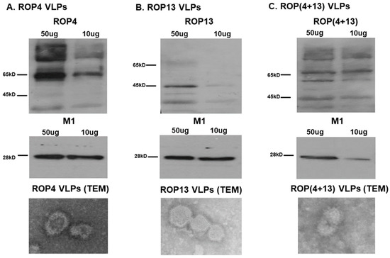 Characterization of virus-like particles (VLPs). The 50 and 10 μg of VLPs were loaded for SDS-PAGE and visualized by western blot. As shown in (A), ROP4 VLPs containing ROP4 proteins and M1 (A) were detected. Similarly, ROP13 VLPs containing ROP13 proteins and M1 (B) were also detected. In case of ROP(4 + 13) VLPs, the presence of ROP4, ROP13 proteins and M1 (C) were confirmed. TEM was used to confirm the shape of ROP4 VLPs (A), ROP13 VLPs (B) and ROP(4 + 13) VLPs (C).