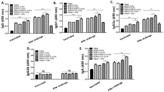 Mice were intranasally immunized with ROP4 VLPs, ROP13 VLPs, ROP4+ROP13 VLPs, and ROP(4 + 13) VLPs at weeks 0 and 4. As seen in Figure 2, all VLPs-immunized mice showed higher levels of antibody responses compared to naïve mice. ROP(4 + 13) VLPs immunization was found to elicit higher levels of serum IgG, IgG1, IgG2a, and IgA compared to ROP4+ROP 13 VLPs immunization (* p < 0.05). It was noted that mice immunized with ROP(4 + 13) VLPs showed the highest levels of T. gondii-specific IgG (Figure 2A), IgG1 (Figure 2B), IgG2a (Figure 2C) and IgA (Figure 2E) antibodies after challenge (* p < 0.05).