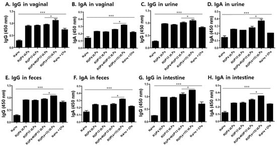 After challenge infection with T. gondii ME49, the vaginal secretion, urine, intestine and feces were collected from the mice to characterize mucosal immune response induced by intranasal immunization. As shown in Figure 3A,C,E,G, significantly higher levels of T. gondii-specific IgG antibodies were observed in mice immunized with ROP(4 + 13) VLPs. Also, IgA (Figure 3B,D,F,H) antibody responses from the mice immunized with ROP(4 + 13) VLPs showed a significantly higher response compared to mice groups immunized with other types of VLP vaccines (* p < 0.05, *** p < 0.001). These results indicate that mucosal immunity was successfully induced by IN immunization with ROP4 VLPs, ROP13 VLPs, ROP4+ROP13 VLPs, and ROP(4 + 13) VLPs.