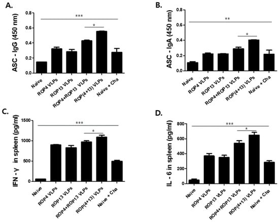 To determine the antibody secreting cell responses, spleen cells were harvested and T. gondii-specific IgG and IgA antibodies secreted into splenocyte culture supernatants were determined by ELISA. ROP(4 + 13) VLPs immunization exhibited higher levels of T. gondii IgG (Figure 4A) and IgA (Figure 4B) antibodies compared to ROP4+ROP13 VLPs vaccination (* p < 0.05). Also, to confirm VLPs vaccine efficacy, the cellular immune response was determined by measuring IFN-γ and IL-6 cytokines secreted from splenocytes cultures supernatants with T. gondii RH stimulation. The observation of the increase in the production of IFN-γ (Figure 4C) and IL-6 (Figure 4D) cytokine from the splenocytes of ROP(4 + 13) VLPs immunized mice supports the efficacy of the VLP vaccine.