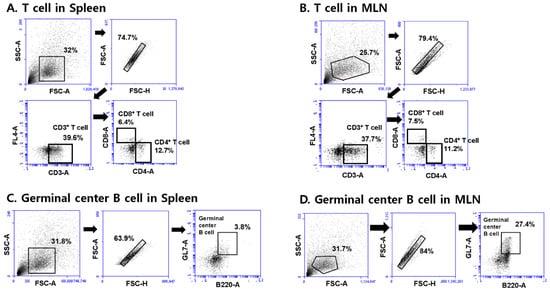 The gating strategy of CD4+, CD8+ T cell and germinal center B cell in spleen and MLN cells. Spleen and MLN cells from mice (n = 5) were collected at day 30 upon challenge infection with T. gondii ME49 and stained with phenotype-specific marker antibodies (CD3, CD4, CD8, B220, GL7). CD4+, CD8+ T cell gating strategy in spleen cells (A). CD4+, CD8+ T cell gating strategy in MLN cells (B). Germinal center B cell gating strategy in spleen cells (C). Germinal center B cell gating strategy in MLN cells (D).