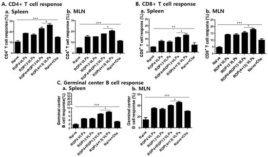 Flow cytometric analysis. Collected spleen and MLN cells from mice (n = 5) were stained with specific surface markers (CD3, CD4, CD8, B220, GL7) and analyzed using FACS. CD4+ T cell response in spleen (A-a, * p < 0.05, *** p < 0.001). CD4+ T cell response in MLN (A-b, * p < 0.05, *** p < 0.001). CD8+ T cell response in spleen (B-a, * p < 0.05, ** p < 0.01). CD8+ T cell response in MLN (B-b). Germinal center B cell response in spleen (C-a, * p < 0.05, *** p < 0.001). Germinal center B cell response in MLN (C-b, * p < 0.05, *** p < 0.001).