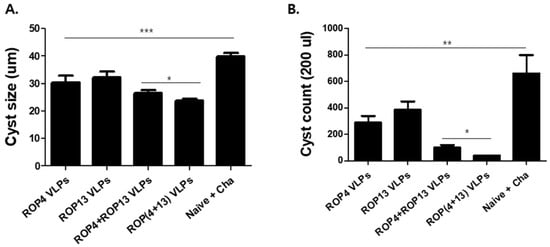 Cyst size and cyst count after T. gondii ME49 challenge. Thirty days after challenge infection with 450 T. gondii ME49 cyst, brain tissues were collected from mice (n = 5). Cyst size ((A), * p < 0.05, *** p < 0.001) and cyst count ((B), * p < 0.05, ** p < 0.01) among VLPs immunization groups were compared. ROP(4 + 13) VLPs of cyst size (27.84um) was significantly reduced compared to naïve challenge (41.04um). Also, 40 cysts were counted from the brains of ROP(4 + 13) VLPs-immunized mice, whereas 660 cysts were counted from naïve challenge mice.