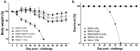 Protective efficacy of immunization with T.gondii VLPs. Naïve or immunized mice (n = 5) were orally infected with 450 T. gondii ME49 cyst after boost immunization. Mice were monitored for 60 days to observe changes in body weight (A) and survival (B) after challenge infection. Upon challenge infection, all immunized mice survived and ROP(4 + 13) VLPs immunization showed the least weight loss, whereas all naïve challenge mice showed rapid weight loss and died on day 35.