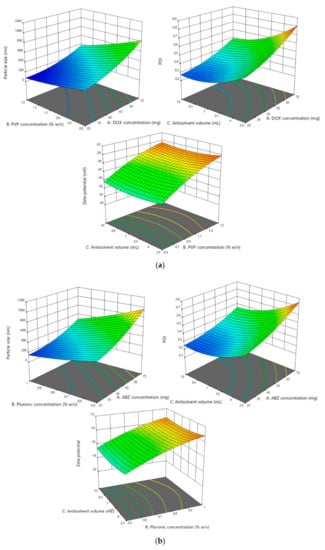 The results showed that the zeta potential of all optimization processes followed the quadratic model. With respect to the analysis results, the F-values of 100.30, 96.56, and 68.34 were obtained for DOX, ABZ-OX, and IVM, respectively. Additionally, the p-values were found to be <0.001 in all cases, demonstrating that the model was significant. The effects of selected parameters on the zeta potentials of the NS are illustrated in the 3D graphs in Figure 2. The only factor to shown a significant effect on the zeta potential of the NS was the stabilizer concentration. In DOX formulation, which contained SLS 0.2% w/v, the increasing concentration of PVP decreased the value of zeta potential. It is well-known that SLS is an anionic surfactant with negative charge []. Therefore, the increase in PVP could possibly decrease the charge of dispersions containing SLS. In the ABZ-OX and IVM formulations, the same trend was observed. PF127 has a higher number of PPO units, resulting in higher thickness of adsorbed polymer, thus lowering the value of the zeta potential. The decrease of zeta potential might be caused by the outer shift of the slipping plane, which is extremely crucial in zeta potential measurement [].