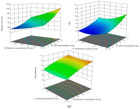 The results showed that the particle size and PDI of all optimization processes followed the quadratic model. In terms of the particle size analysis, the F-value was found to be 20.77, 19.85, and 19.55 for DOX, ABZ-OX, and IVM NS, respectively. The F-value of 14.83, 15.72, and 15.68 were obtained in PDI analysis for DOX, ABZ-OX, and IVM NS, respectively. Moreover, the p-value of <0.001 was found in all cases, indicating that the factors selected had a significant effect on the particle size and PDI. The representative 3D graphs describing the effect of selected parameters on the particle sizes and PDI are shown in Figure 2.