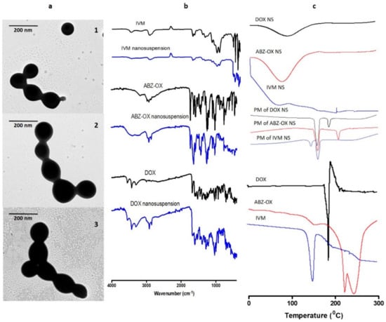 Figure 3c depicts the thermogram profiles of DOX, ABZ-OX, IVM, and their respective NS formulations. The sharp endothermic peaks at 168 °C in DOX, 226 °C in ABZ-OX, and 156 °C in IVM corresponded to the melting point of drug crystals. These peaks were also found the physical mixture. However, these peaks were not observed in NS formulations, indicating the change of the nature of drugs from crystalline forms to amorphous. This may be caused by the method of preparation of NS. It was previously reported that the bottom-up method was able to produce amorphous nanoparticles [].