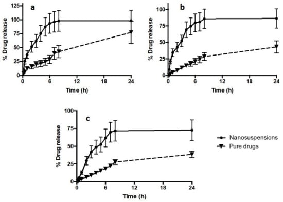In vitro release profiles of (a) DOX NS, (b) ABZ-OX NS, and (c) IVM NS in comparison with the pure drug (means ± SD, n = 3).