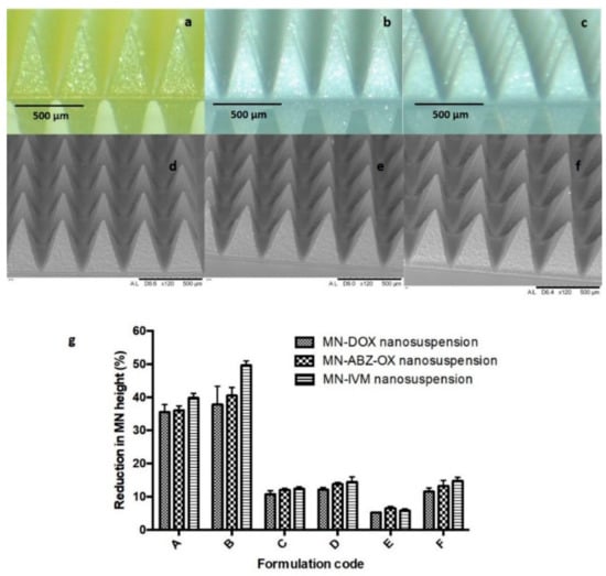 Light microscope images of the MN of Formulation E containing (a) 30% w/w of lyophilized NS of DOX, 15% w/w of PVA, and 5% w/w of PVP; (b) 30% w/w of lyophilized NS of ABZ-OX, 15% w/w of PVA, and 10% w/w of PVP and (c) 30% w/w of lyophilized NS of IVM, 15% w/w of PVA, and 10% w/w of PVP (C); SEM images of the MN containing drug NS of (d) DOX, (e) ABZ-OX, and (f) IVM (F); (g) Comparison of the percentage of height reduction of MN needles formulations containing 20% w/w of lyophilized NS of drugs and 50% w/w of PVP (formulation code A in each formulation); 30% of lyophilized NS of drugs and 50% of PVP (formulation code B in each formulation); 20% w/w of lyophilized NS of drugs and 15% w/w of PVA (formulation code C in each formulation); 30% w/w of lyophilized NS of drugs and 15% w/w of PVA (formulation code D in each formulation); 30% w/w of lyophilized NS of drugs and 15% w/w of PVA and 5% w/w of PVP (formulation code E in DOX formulation); 40% w/w of lyophilized NS of drugs and 15% w/w of PVA and 10% w/w of PVP (formulation code F in each formulation) (means ± SD, n = 3).
