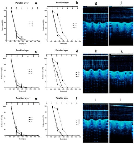 The results of the skin insertion study were in close agreement with those of the mechanical strength studies. In this evaluation, the same three candidate formulations were able to penetrate three layers of Parafilm®M. Figure 6a–f shows the insertion ability of the MNs presented as the number of holes created in each layer of Parafilm®M. The mean thickness of each layer is approximately 126 μm. Therefore, the MNs inserted up to 378 μm, relating to approximately 75.6% of the MN height. These results suggest that the needle lengths which inserted into the skin model was similar to a study reported previously []. Moreover, these values were similar with previous studies illustrating the insertion of polymeric MNs into human skin []. In addition to this, OCT was also employed in insertion studies. The selected formulations were evaluated in terms of insertion ability in both Parafilm®M and full-thickness porcine skin. Several studies have shown the advantages of this technique in the investigation of MN insertion in Parafilm®M and skin [,]. The results are exhibited in Figure 6g–l. MN penetration depth of Formulation E in Parafilm®M were found to be 369.12 ± 18.43 μm, 371.88 ± 19.19 μm, and 370.17 ± 17.13 μm for DOX, ABZ-OX, and IVM formulations, respectively. These insertion depths were in close agreement with those observed in similar studies carried out in full-thickness, showing depths of 368.17 ± 16.33 μm, 372.03 ± 19.87 μm, and 369.22 ± 13.93 μm for DOX, ABZ-OX, and IVM formulations, respectively.