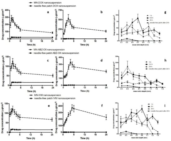 The drug concentration and time profile of DOX in epidermis (a) and dermis (b), DEC in epidermis (c) and dermis (d), and ABZ-OX in epidermis (e) and dermis (f) layers of excised full-thickness neonatal porcine skin, following the application of MN, in comparison with the application of free-needle patches (means ± S.D., n = 3). The concentrations of drugs in a different layer of neonatal porcine skin, following the application of MN containing (g) DOX NS; (h) ABZ-OX NS, and (i) IVM NS, in comparison with the free-needle patch (means ± S.D., n = 3).