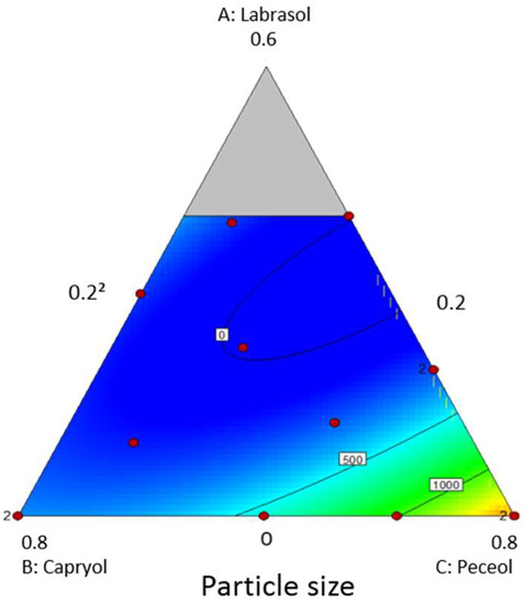 A ternary phase diagram (Table 2 and Figure 1) was constructed to study the phase behaviour of oil/surfactants over the whole concentration range. Particle size expressed in numbers led to a better predictive model with a higher R2 than the one using values expressed in volume. The blue region indicates the self-nanoemulsifying region, with a lower particle size. The particle size optimisation studies suggested two optimal excipient combinations with the following composition: