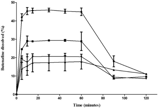 Hydrophilic fumed silica particles indicated a greater and faster release of butenafine nanoemulsions type II (F1 > F2 > F3~F4) (Figure 2). Increasing the pH from 1.2 to 6.8 to mimic the intestinal pH resulted in a sharp precipitation, which can be linked with a spring–parachute effect. This can explain the low absorption of butenafine orally [21], as that only allows for absorption in the upper part of the gastrointestinal tract [33,34]. Butenafine is more soluble in acidic pH as a hydrochloride salt, while its base (pKa: 9.23) has limited water solubility (<100 ng/mL) [35]. Formulation F1 allows for higher solubilised levels up to 90 min (p < 0.05; one-way ANOVA), which is critical for enhancing oral absorption.
