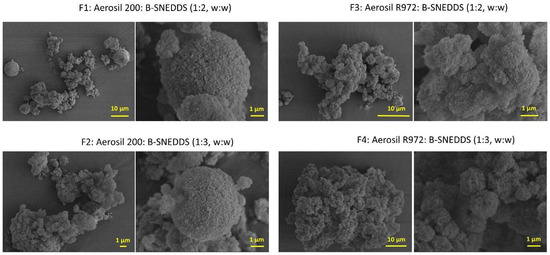 The morphology of the four solid B-SNEDDS formulations was observed by scanning electron microscopy (Figure 3). At higher magnification, the large surface porosity of both silicon dioxide carriers can be observed. This explains the high amount of liquid SNEDDS that is able to be adsorbed on to the solid carriers, up to three times their own weight. However, agglomeration between carrier particles was more noticeable in those formulations containing a higher ratio of liquid SNEDDS (F2 and F4), which can explain the hindered release observed. In the F3 and F4, both containing the most hydrophobic carrier (Aerosil R972), it was observed that even at the lower ratio of liquid-SNEDDS (1:2 w:w), the aggregation between particles is still evident to some extent.