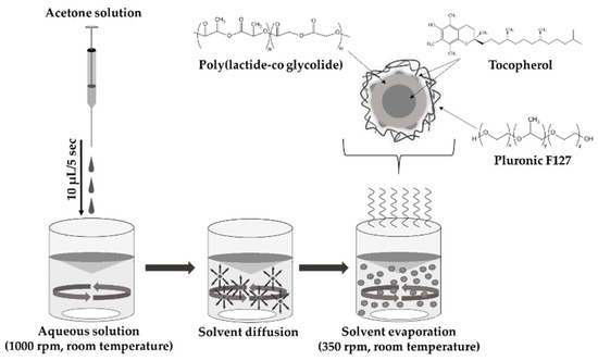 The TP-loaded PLA/PLGA NPs were prepared by nanoprecipitation method (Figure 1). The detailed experimental conditions were presented previously [13]. Briefly, the PLA/PLGA and TP with increasing concentrations (see Table 1) were dissolved in 1.5 mL of acetone, which was dropped slowly (10 μL/5 s) into the aqueous solution of the PLUR stabilizer (15 mL) under room temperature using magnetic stirring with 1000 rpm. In the interest of the evaporation of acetone, the prepared samples were further stirred (350 rpm) for two days. The dispersion was centrifugated with 40 mL MQ water at 12,000 rpm (t = 15 min, T = 25 °C). After the supernatant was removed, the NPs were redispersed in MQ water and the washing methods were repeated two times. The obtained NPs samples were freeze-dried by liquid nitrogen and lyophilized (by Christ Alpha 1-2 LDplus apparatus).