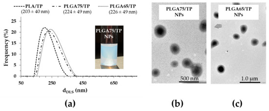 The particle size distribution of the TP-loaded PLA and PLGA NPs (a), and representative TEM images of the PLGA75–(b) and PLGA65–(c) based composites.