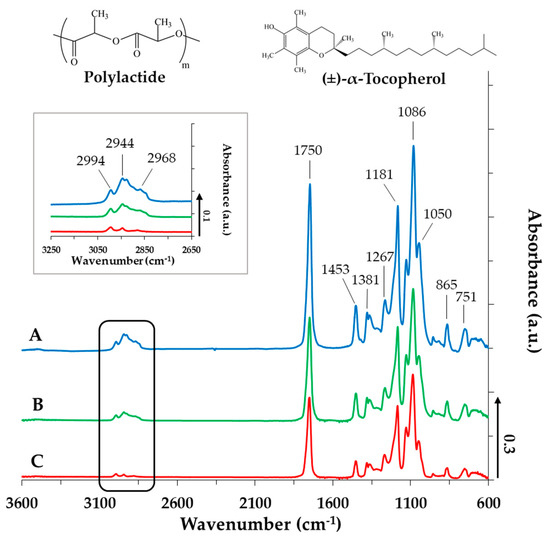 IR spectra of the TP-loaded PLA NPs (A: cTP = 0 mg·mL−1; B: cTP = 2.5 mg·mL−1; C: cTP = 5 mg·mL−1, cPLA = 10 mg·mL−1 and cPLUR = 0.1 mg·mL−1).