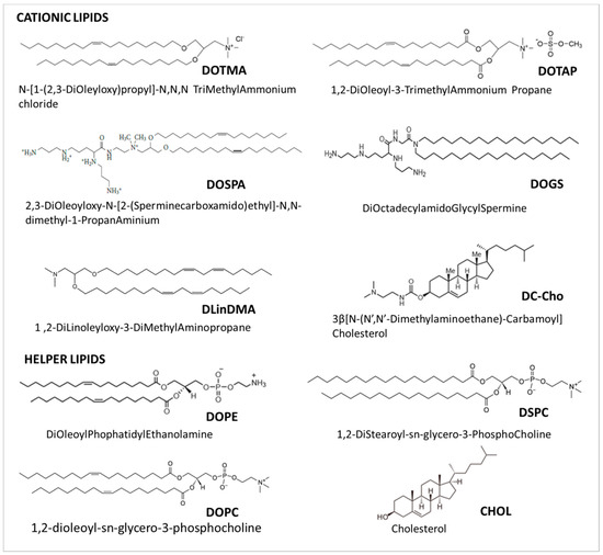 Vesicles can be prepared by using positively-charged lipids, i.e., the 1,2-DiOleoyl-3-TrimethylAmmonium Propane (DOTAP), achieving cationic liposomes which can electrostatically attract the negative phosphate groups of NABDs, increasing their encapsulation efficiency. Moreover, the cationic liposomes also facilitate the intracellular uptake of NABDs and their endosomal escape, more efficiently if “helper” lipids are included in the formulation [19].