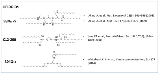 Love and coworkers have also made complexes by combining lipidoid, cholesterol, and a polyethylene glycol modified lipid in a yield weight fractions of 52:20:28 (wt:wt:wt), obtaining an siRNA-directed liver gene silencing in mice at doses below 0.01 mg/kg [41]. A lipidoid nanoparticle which mediates potent gene knockdown in hepatocytes and immune cell populations after IV administration to mice, with siRNA EC50 values as low as 0.01 mg/kg, was successfully produced also by Whitehead and collaborator [39]. The lipidoids structures used in the cited works for siRNA-lipid complexes production are given in Figure 4.