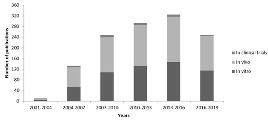 During the last 20 years we assisted in a fast growth of the attention of the scientific community relative to the RNAi mechanism, and thus to NABDs new formulations, including small interfering RNA (siRNA), associated with lipid-based delivery strategy to be use for the cure of several diseases. As illustrated in Figure 5, starting from the 2001, year in which siRNA was successfully delivered into mammalian cells for the first time [103], until 2019, the numbers of publications related to “siRNA and liposome” in vitro, in vivo and in clinical trials applications, have increased dramatically, and different liposomal-based siRNA formulations have already shown good safety records in humans.