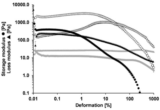 Oscillatory measurements of HNC at 32 °C (black icons) and the emulsion containing 4.8% methyl cellulose at 5 °C (grey icons) and 32 °C (open icons), mean ± SD, n = 3.