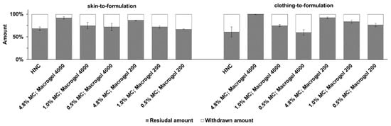Furthermore, the effect of different methyl cellulose concentrations and macrogols on substantivity was investigated. The results of the ex vivo substantivity test are shown in Figure 2. It can be seen that skin-to-formulation or clothing-to-formulation contact removes about one third of HNC. Formulations with 0.5% or 1.0% methyl cellulose showed comparable results. About 70% of the applied emulsion remained at skin surface after simulated contact. The two emulsions with a methyl cellulose concentration of 4.8% showed residual amounts of 86% and 100%. This shows that neither skin-to-formulation nor clothing-to-formulation removed a substantial share of the applied emulsion.