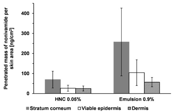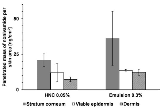 Figure 3 shows the penetrated amount of nonivamide from HNC 0.05% and an emulsion with 0.9% in the different skin layers. From HNC 0.05%, about 70 ng/cm2 penetrated in the stratum corneum after 4 h incubation time. In both the viable epidermis and dermis we could find about 25 ng/cm2. The new emulsion with an API concentration of 0.9% resulted in a mean of 250 ng/cm2 nonivamide in the stratum corneum, 100 ng/cm2 in the viable epidermis and 60 ng/cm2 in the dermis. The penetrated amount in the stratum corneum and viable epidermis was about three to four times higher compared to that achieved using HNC 0.05%. Therefore, the drug concentration was set to 0.3% in a subsequent experiment. A reduced API concentration of 0.3% led to a reduced penetrated amount (Figure 4). Drug concentration in the viable epidermis, the site of action, was about 14 ng/cm2 from the emulsion and 12 ng/cm2 from HNC, and was thus comparable to HNC 0.05%. Although the emulsion contained a higher concentration of API, the penetrated amount was almost the same. This can be explained by the composition of the two formulations. HNC contained 15% of propylene glycol and 9% of ethanol, which are both known as penetration enhancers [,,], whereas the emulsion did not contain propylene glycol. Differences in penetrated amount from HNC 0.05% between the two experiments were related to the use of skin from different donors. It can thus be concluded that the emulsion delivers an amount of the active ingredient to the skin that is suitable for therapy. The penetrated amount can be tuned by adjusting the drug concentration in the emulsion.