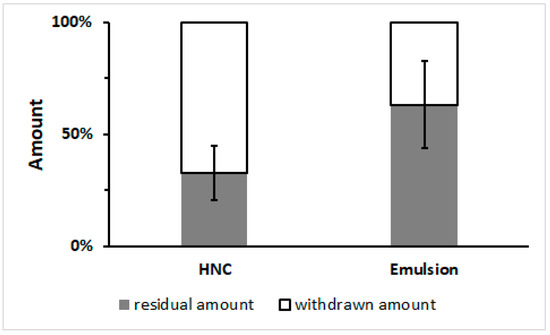 Finally, the in vivo substantivity of the thermogelling emulsion was compared to that of HNC. The results are given in Figure 5. It can clearly be seen that from HNC, 67% of the formulation was transferred to the clothing, whereas from the emulsion only 37% was removed. This is in accordance with the ex vivo substantivity test, which had already shown that the emulsion was superior to HNC. Nevertheless, the SDs were higher and the differences between the two formulations were slightly less evident in the in vivo experiment. We believe that this was to be expected as a higher degree of variability is typical for in vivo experiments. As our study group was very homogeneous regarding age, gender and ethnicity, we believe that the variability manly reflects different physical activity among the volunteers, who were not given any restriction on to how to behave during the application interval. Therefore, the in vivo experiment better reflects real life conditions compared to the ex vivo experiment. As we could still find a significant difference between substantivity in the in vivo experiment, we are convinced that the emulsion will be superior to HNC under real-life conditions.