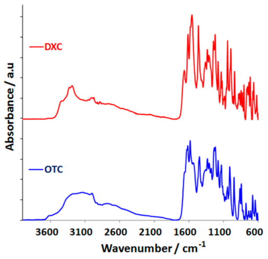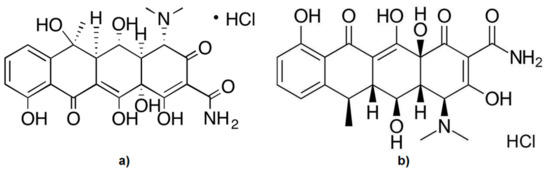 Antimicrobial resistance has become a major problem in recent years, and many studies in medicine are focused on this topic. Antibiotics are used both in human and veterinary therapies for infections reduction, and therefore, the role of resistance monitoring is very important [1,2]. Oxytetracycline hydrochloride (OTC) was discovered in the 1940, and was the first member of the tetracycline group [3]. The other tetracyclines were identified later, such as doxycycline hydrochloride (DXC) [4], which came into human pharmacological use in 1967. Due to their broad spectrum of action, OTC and DXC (Figure 1) are antimicrobial substances with bacteriostatic activity that are indicated for the treatment of some infections caused by Gram-negative and Gram-positive microorganisms [5]. OTC inhibits collagenase, preventing the collagen destruction that occurs at the marginal periodontium, and which also inhibits alveolar bone resorption while having an antibacterial effect. Generally, tetracyclines are effective against most spirochetes and anaerobic bacteria; this action is relevant in terms of periodontitis [6,7,8,9].