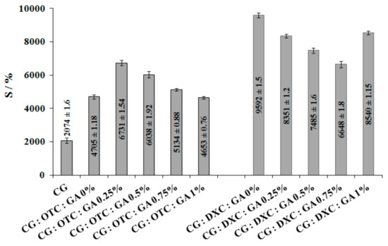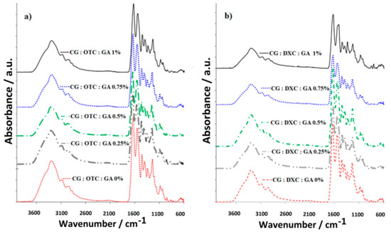 According to Table 3, the intensity ratio of the bands AOH/AI (A~3300/A~1630 cm−1) indicates that the hydrolysis degree increased by the addition of OTC, reaching a maximum for 0.25% GA, while DXC presence did not increase the hydrolysis degree.
