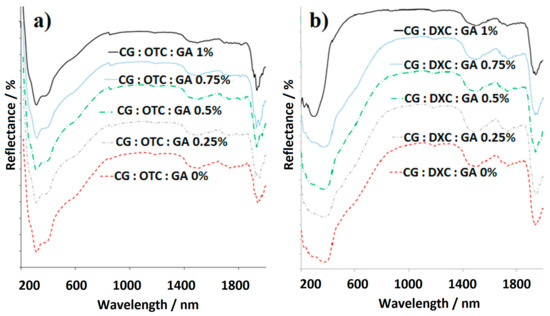 The UV/Vis/NIR spectra of collagen sponges with different GA concentrations with (a) OTC or (b) DXC.