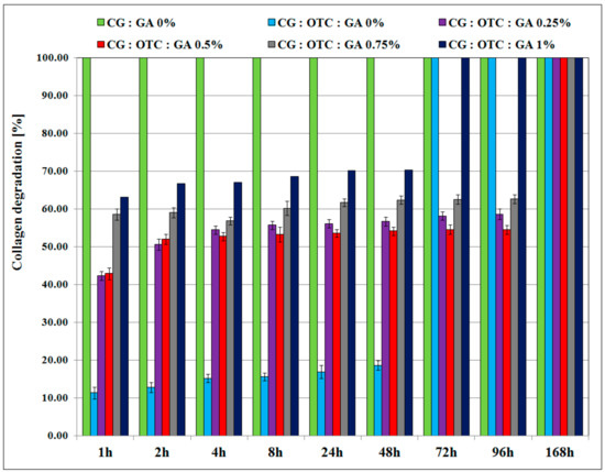 Three samples were evaluated for each composition and the results of collagen degradation are expressed as mean values ± standard deviation.