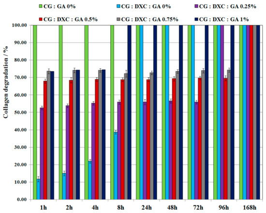 The percentage of collagen degradation from collagen sponges with or without DXC and different GA concentrations.
