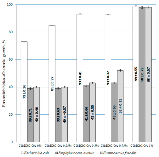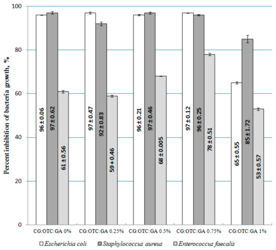 The results presented in Figure 8 demonstrate that in most cases for a concentration of 1% GA into the CG–OTC sponges, the inhibition percent of bacteria growth decreases. On the tested samples, the best antibacterial effect was demonstrated against Escherichia coli (Gram-negative bacterium), while the lowest was demonstrated for the bacterium Enterococcus faecalis (Gram-positive bacterium). As it is well known, Gram (+) bacterium was much more difficult to destroy due to the more complex structure of the cell wall (several layers of peptidoglycan), which is than Gram (−) bacteria whose cell wall is relatively thin and composed of a single peptidoglycan layer [54]. OTC, being a broad-spectrum antibiotic that is active against a wide variety of bacteria, works by interfering with the ability of microorganisms to produce essential proteins. Without these proteins, the microorganism cannot grow and multiply. Therefore, OTC stops the spread of the bacterial infection and the remaining bacteria are killed [5]. The results indicate that 0.5% and 0.75% GA represent the optimal content of the cross-linking agent for the CG-OTC sponges. In the case of CG-DXC sponges, the optimal content of GA is 1% (Figure 9). These data revealed that the new collagen sponges with OTC present a better antibacterial activity against Gram-positive and Gram-negative bacteria than systems with DXC. The action of DXC, which is also a broad-spectrum antibiotic, consists of inhibiting the synthesis of bacterial proteins by binding to the 30-S ribosomal subunit, and stops bacterial growth, giving the immune system time to kill and remove the bacteria [55].