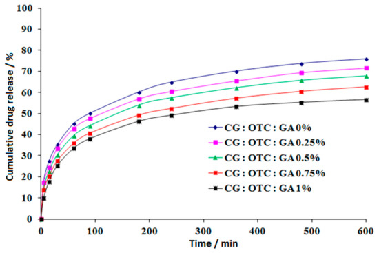 The antibiotics delivery profiles represented as cumulative drug-released percentage versus time are presented in Figure 10 for CG–OTC and in Figure 11 for CG–DXC.