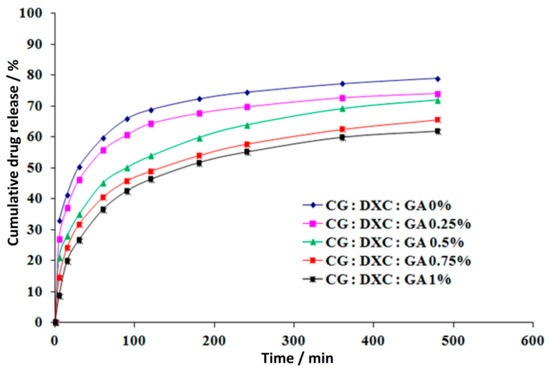 For both antibiotics, the burst release effect is more pronounced for smaller concentrations of GA. In the case of sponges with OTC, the drug-released percentage in the first 90 min is 50.07% for CG:OTC:GA 0% and 47.65% for CG:OTC:GA 0.25%, while for the sponges with DXC, the drug released percentage in the first 60 min is 59.62% for CG:DXC:GA 0% and 55.68% for CG:DXC:GA 0.25%. The increase of GA amount between 0.50–1.00% minimized the fast release of about 11.5–24.0% for CG–OTC sponges and about 24.50–38.90% for CG–DXC sponges compared to the corresponding non-cross-linked sample. It is obvious that the burst release effect is more evident for DXC-loaded collagen sponges.