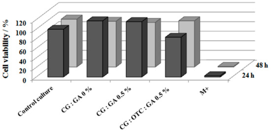 For in vitro cytotoxicity analysis, both the quantitative method by MTT test and the qualitative method for cell analysis by hematoxylin–eosin staining were used in parallel. Considering the results from the antimicrobial activity, enzymatic degradation, and swelling behavior, for the cytotoxic test, the collagen sponge containing OTC and 0.5% GA was chosen and compared with the collagen sponges non-treated or treated with GA (0% and 0.5% GA).
