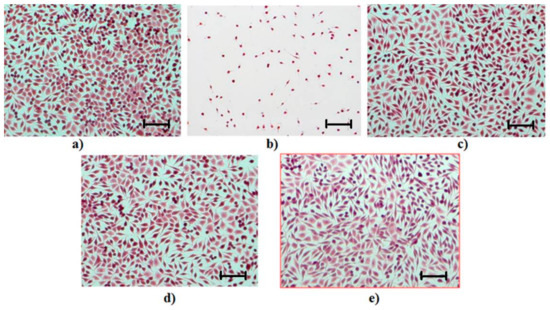 Image of cell morphology for: (a) the control culture; (b) the cell culture treated with 0.003% hydrogen peroxide, with the role of M+ (positive control); (c) the culture in contact with the CG:GA 0% sponge; (d) the culture in contact with the CG:GA 0.5% sponge; and (e) the culture in contact with the CG:OTC:GA 0.5% sponge. Scale bar: 50 µm.
