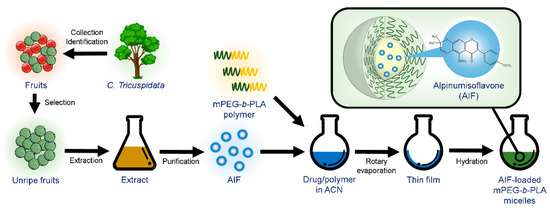 Extraction of alpinumisoflavone (AIF) from unripe C. tricuspidata fruits and preparation of AIF-loaded polymeric micelles using thin-film hydration method.