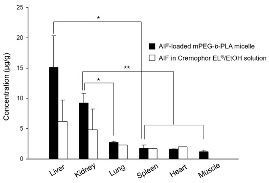Mean concentration time profiles of alpinumisoflavone (AIF) in each tissue within 8 h after intravenous (i.v.) administration of AIF-loaded mPEG-b-PLA micelles and AIF dissolved in 25% Cremophor EL®/ethanol (EtOH) solution to rats (* p > 0.05, ** p < 0.01).