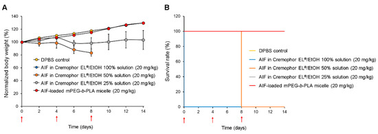 Relative body weight change and survival rate of rats after multiple intravenous (i.v.) injections of DPBS control, alpinumisoflavone (AIF) dissolved in 100% Cremophor EL®/ethanol (EtOH) solution, AIF dissolved in 50% Cremophor EL®/EtOH solution, AIF dissolved in 25% Cremophor EL®/EtOH solution, and AIF-loaded mPEG-b-PLA micelles on day 0, 4, and 8. (A) Relative daily body weight change. (B) Survival rate demonstrated using Kaplan–Meier plot [42]. Red arrows indicate intravenous injections of the formulations.