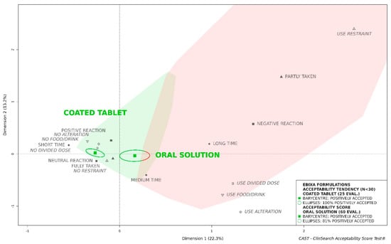 As the barycenter of all the 25 evaluations of the coated tablet was assigned to the “positively accepted” profile, together with 100% of the surrounding confidence ellipses, this formulation tended to be considered as accepted (see Figure 1). Although the barycenter of all the 60 evaluations of oral solution was assigned to the “positively accepted” profile, a significant part of the confidence ellipses was assigned to the “negatively accepted” profile. These results highlight that in the whole population, regardless of patient characteristics, the oral solution was less well accepted than the coated tablet which presumably masked the aversive taste of the API.